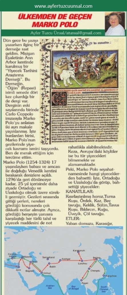 Dün gece bu yazıyı yazarken ilginç bir derneğe rast geldim. Mişigan Eyaletinin Ann Arbor kentinde kurulmuş bir “Yiyecek Tarihini Araştırma Derneği”. Bu Derneğin, “Öğün” (Repast) isimli senede dört kez çıkardığı bir de dergi var. Derginin eski sayılarında birinde Carlo Coppolo imzasıyla Marko Polo’yu anlatan iki ayrı makale yayınlanmış. İşte bunlardan birisi, Marko Polo’nun gezilerinde yiyecek kavramı ismini taşıyordu. Ben de merak ettiğim için tercüme ettim.